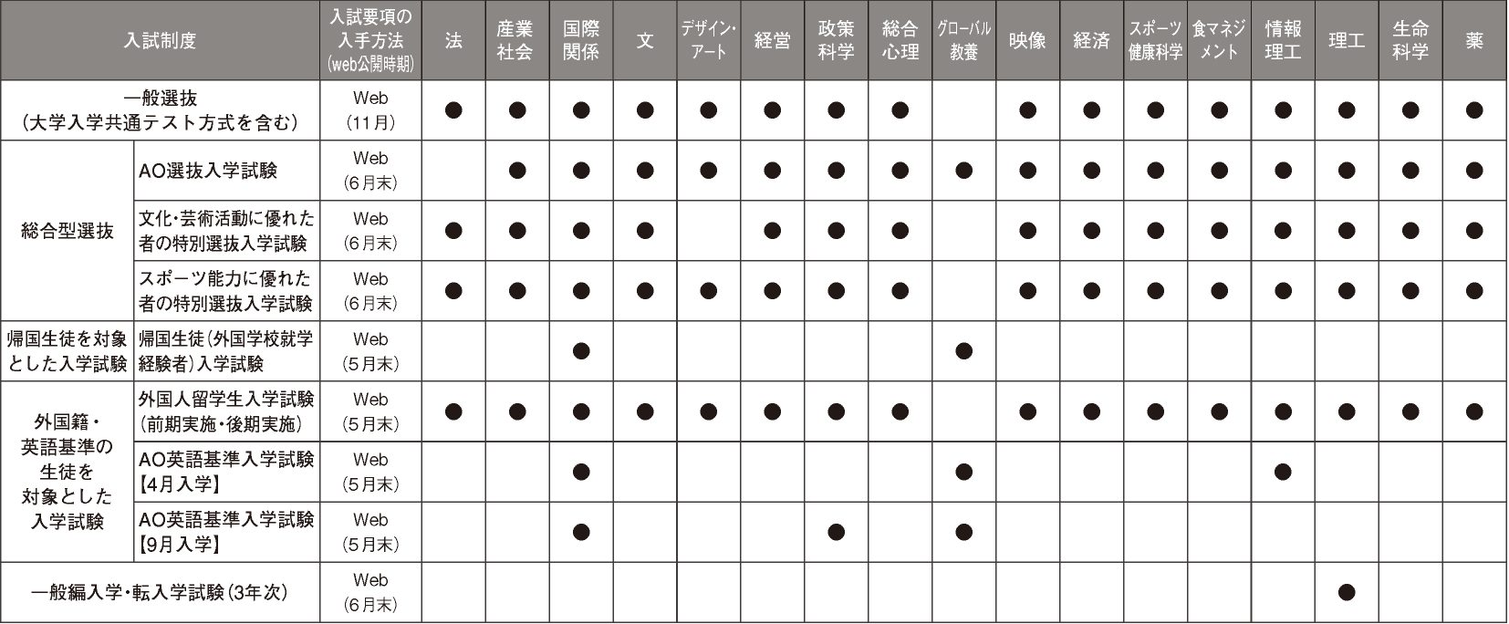 入学試験の制度・実施学部一覧