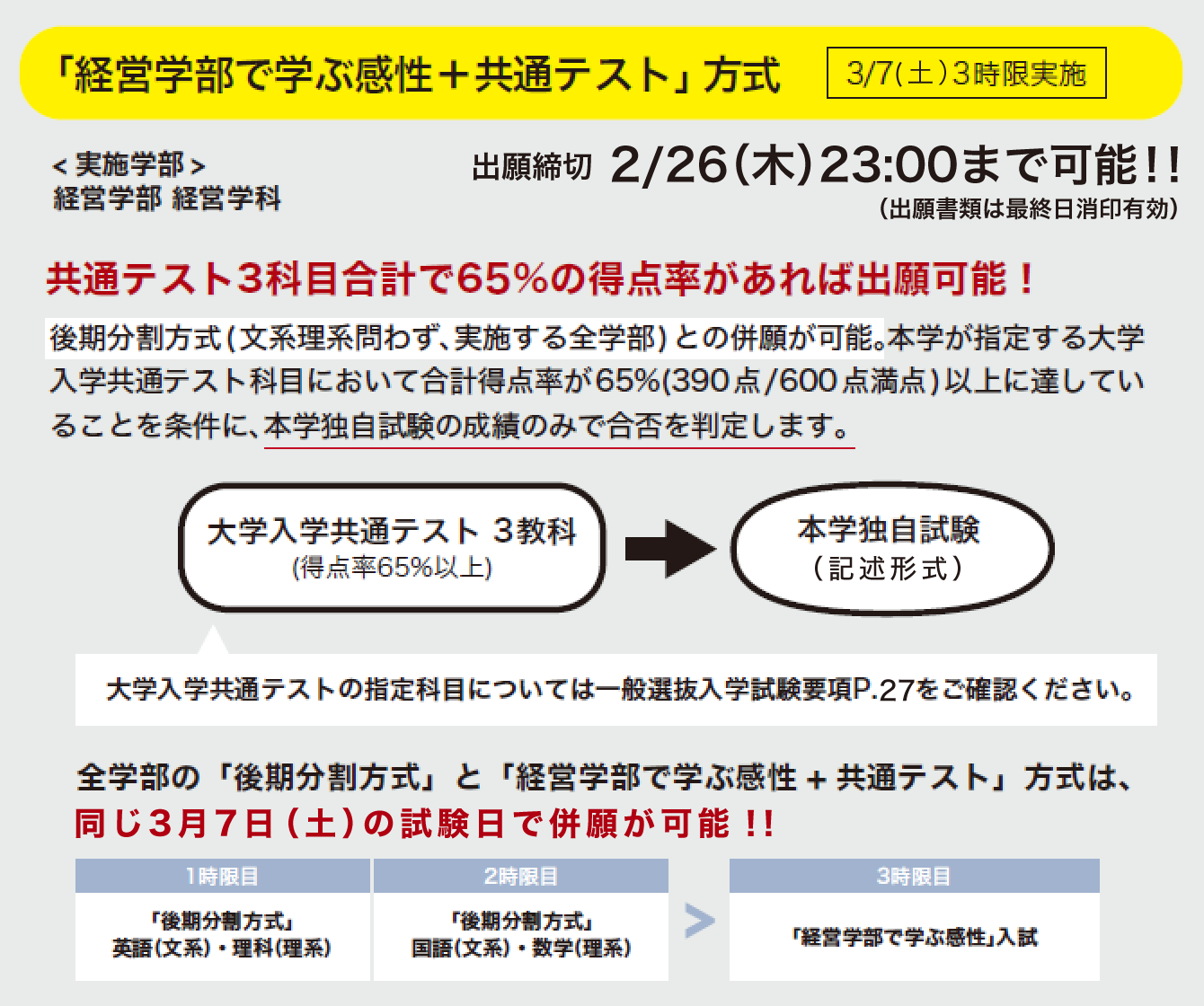 - 3月7日(土)試験実施 後期分割方式、「経営学部で学ぶ感性+共通テスト」方式