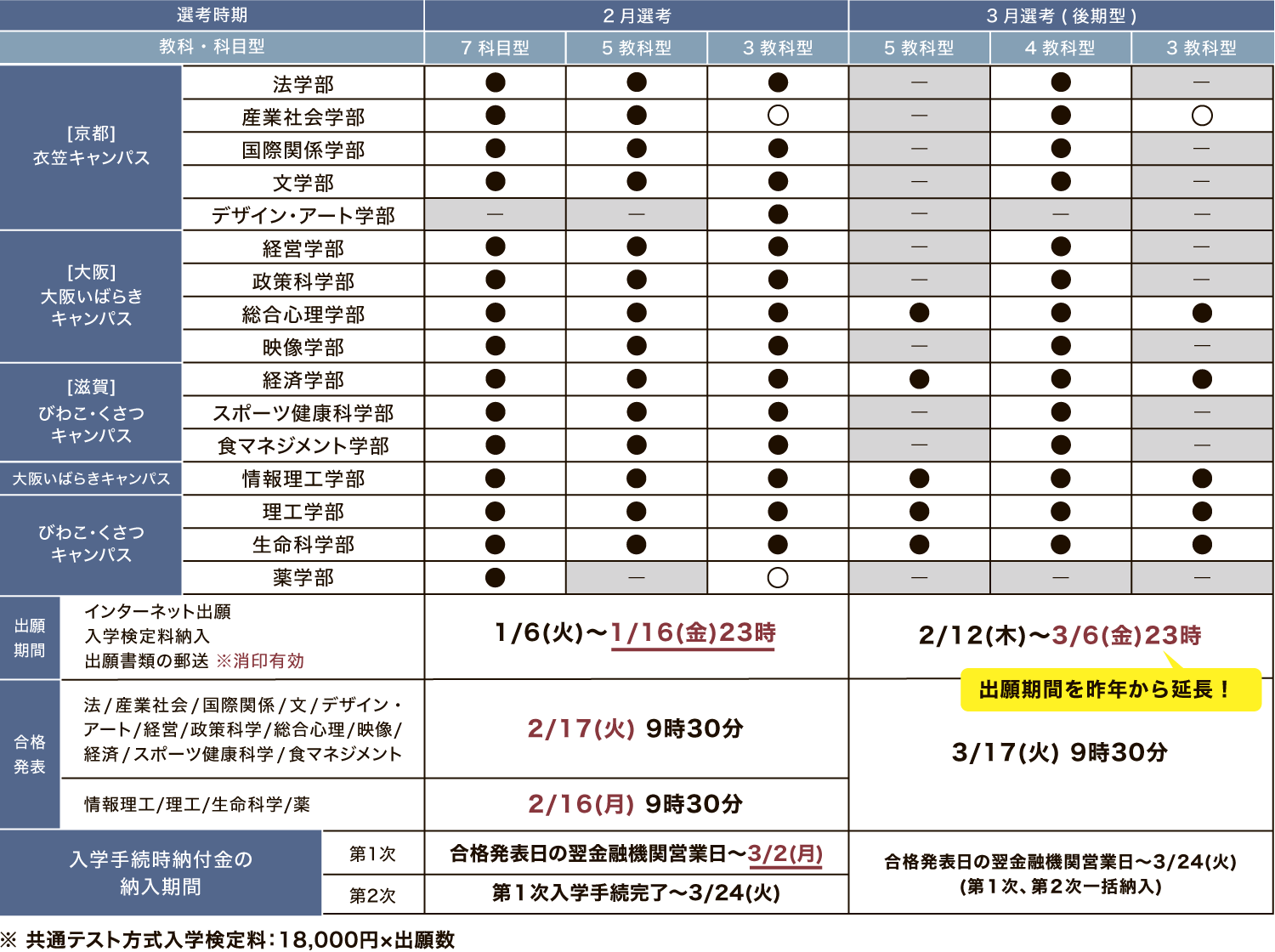 立命館大学の3月入試は、国公立大学の二次試験(2月25日)後も出願することができます。状況を踏まえてしっかり検討できる出願期限になっています。