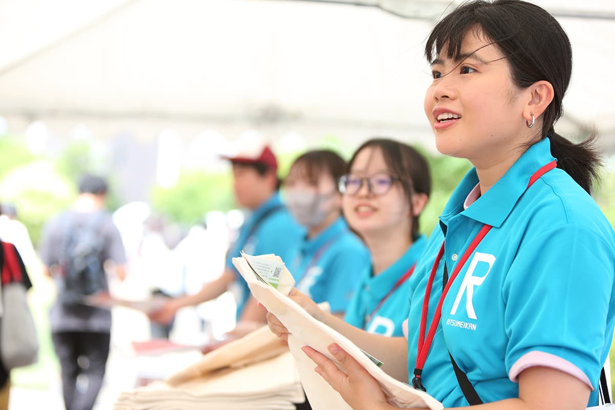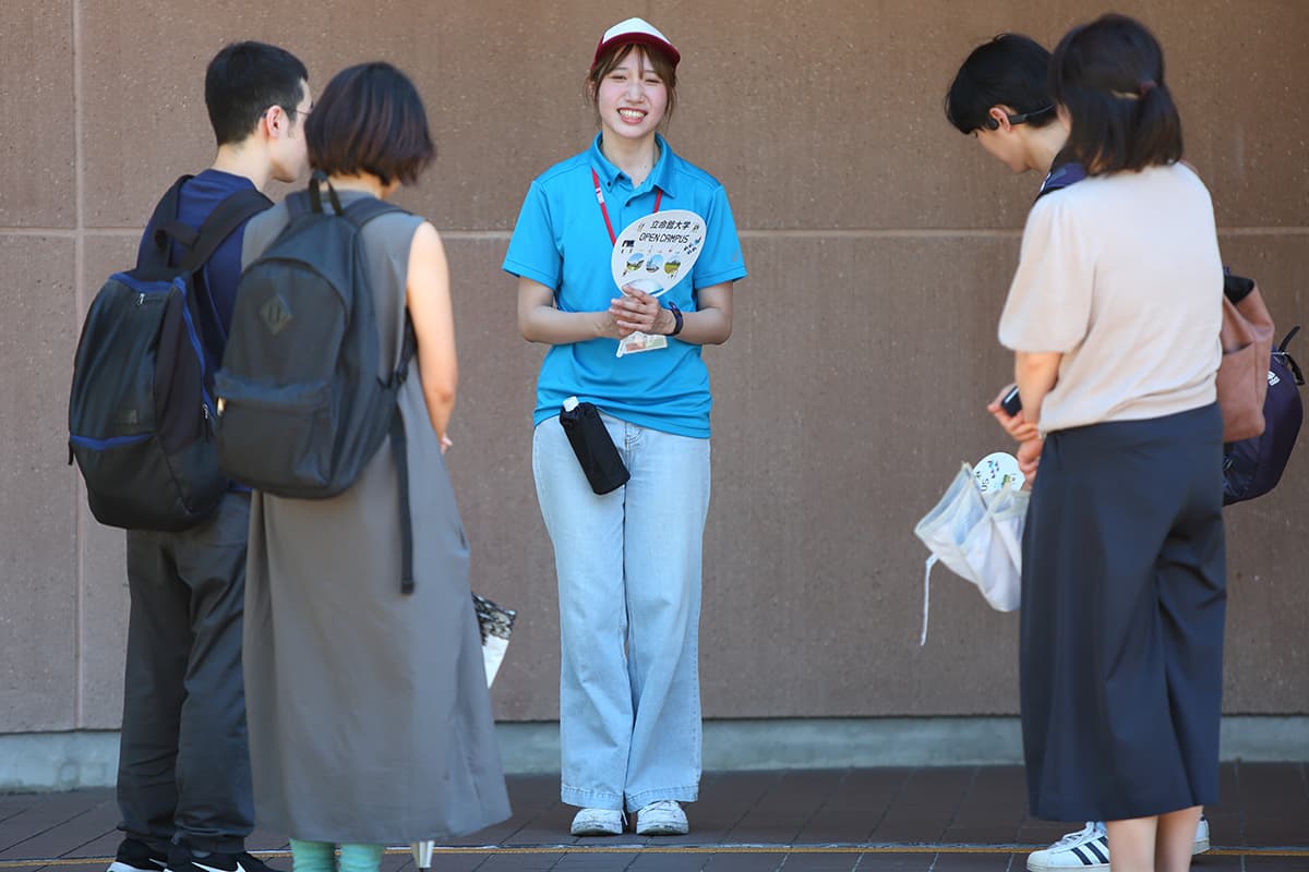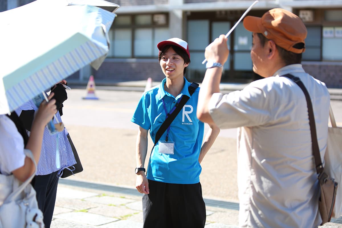 衣笠キャンパス学生スタッフ 各キャンパスの在学生で構成される入試広報学生スタッフがキャンパス内のあちこちで来場者をサポートしました。出身地や入試方式など多様なバックグラウンドを持つ学生たちが、「がんばる高校生を応援したい!」という想いで活動しています。 衣笠キャンパスインデックス