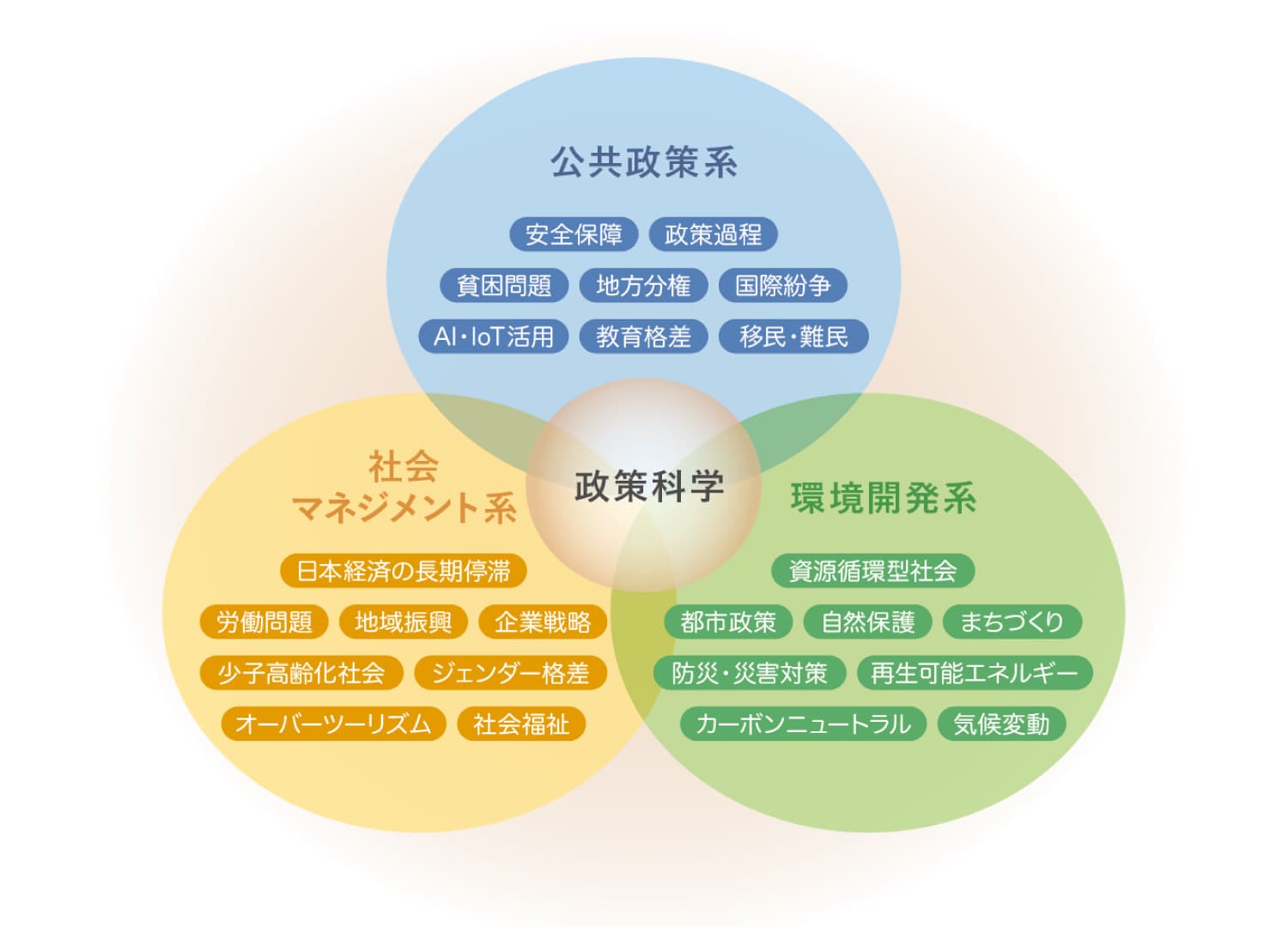 政策科学部では、「公共政策系」「環境開発系」「社会マネジメント系」の3つの学系を柱とする学びを展開しており、それぞれの学系を系統的・横断的に学修することで、複眼的で多角的な視野を獲得します。