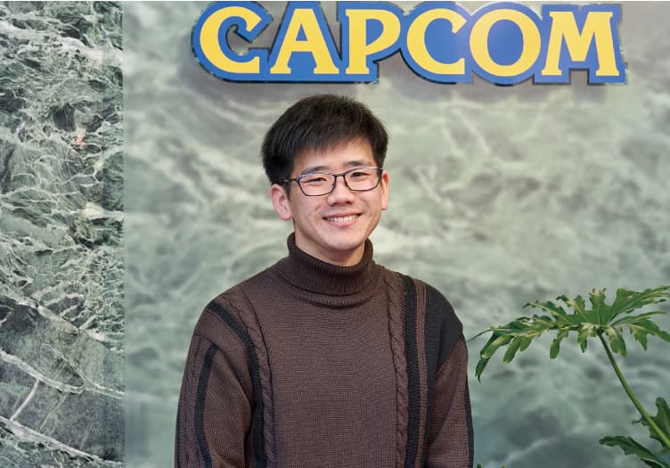 2018年、映像学部に入学。2022年、株式会社カプコン入社。ゲームプログラマーとしてタイトルの開発に従事。業務は、ゲームの演出に必要なライティングの状況(時間や天候に合わせた変化など)に応じた制御機能の実装をはじめ、絵づくりに必要なRendering関連機能の制御や不具合対応、また開発効率化のために必要なツールの作成など多岐にわたる。